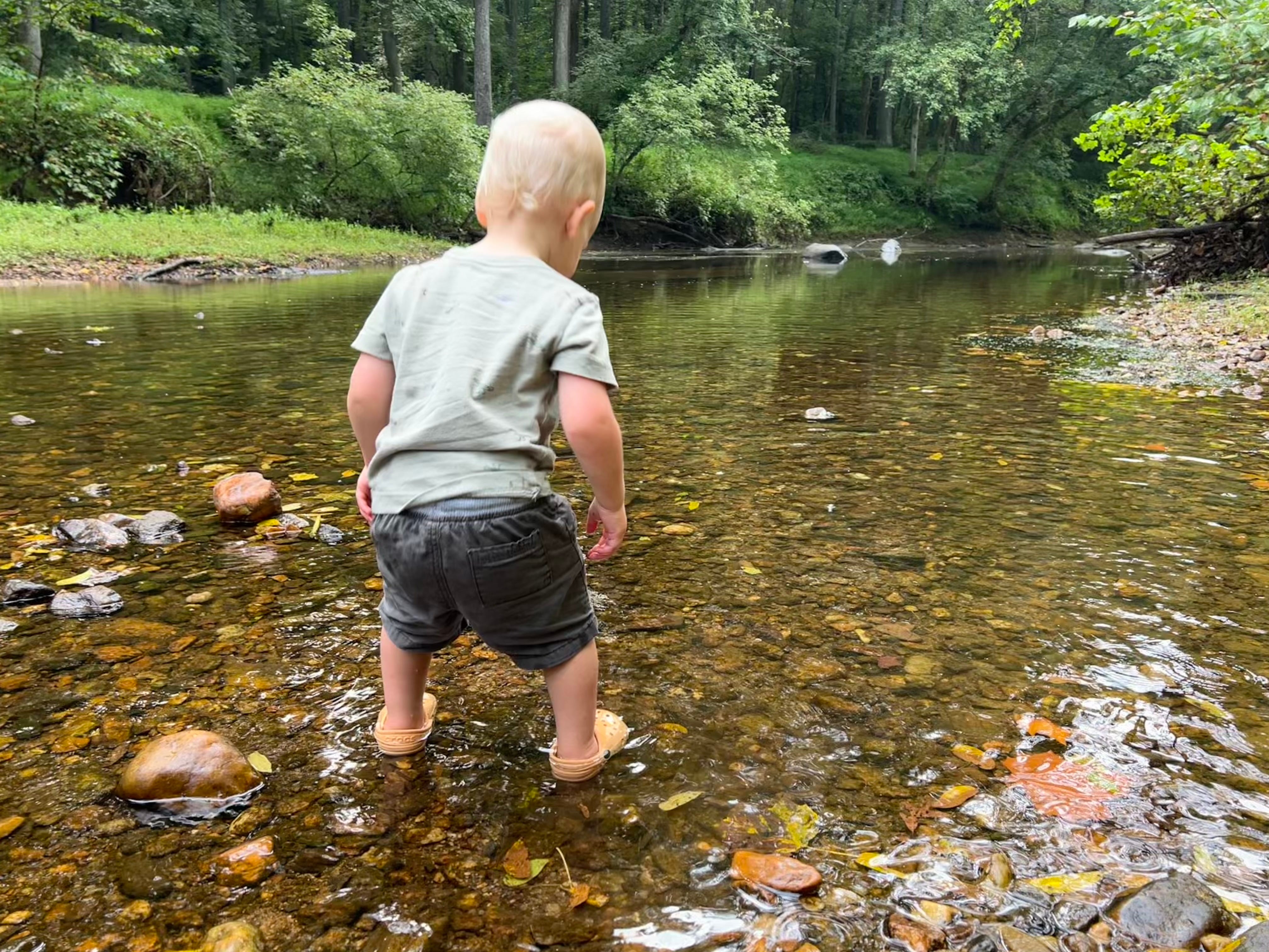 There’s a little mini-me standing five feet away playing in gorgeous, clear water in a quiet, rainy forest.
