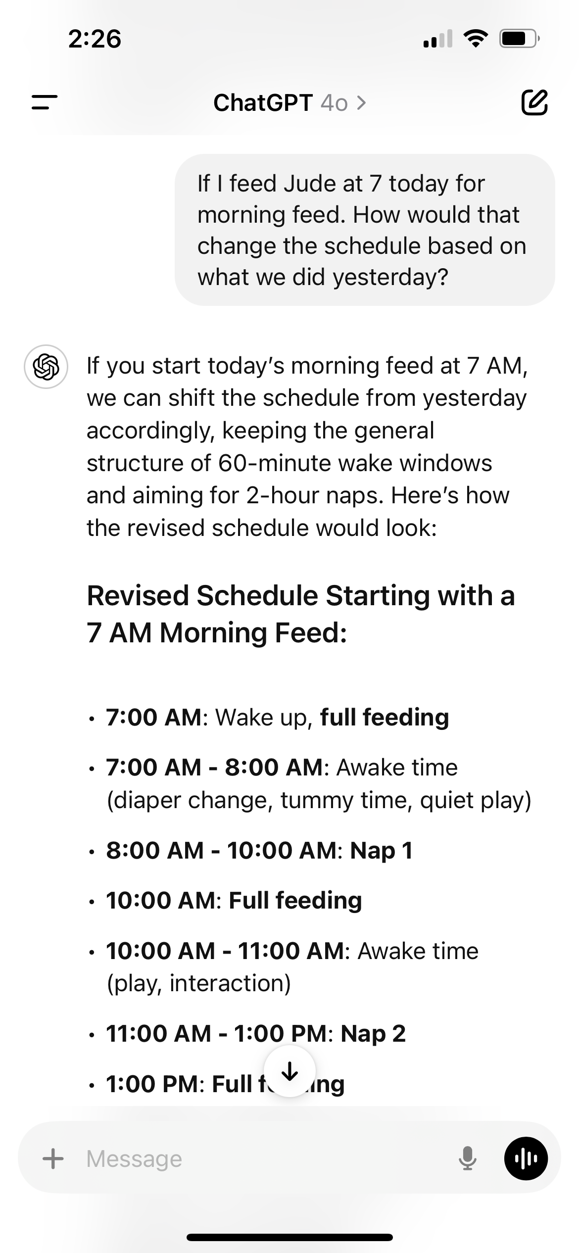 Fueled by my desperation and kicking privacy to the curb, I brain-dumped every fact my sleep-deprived mind could muster about the situation and told it to act like a “no-nonsense, brilliant child-rearing coach with expertise in sleep training”.