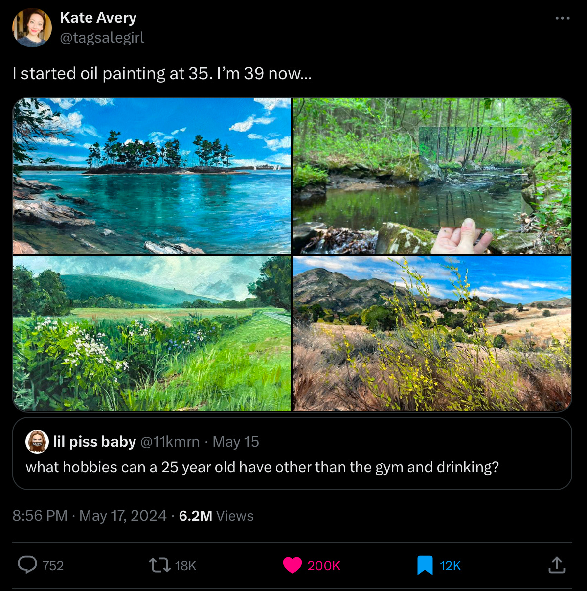 The post below went viral earlier this year. Someone had asked “what hobbies can a 25 year old have other than the gym and drinking?”, to which a woman replied with several gorgeous oil paintings saying “I started painting at 35. I’m 39 now…”.
