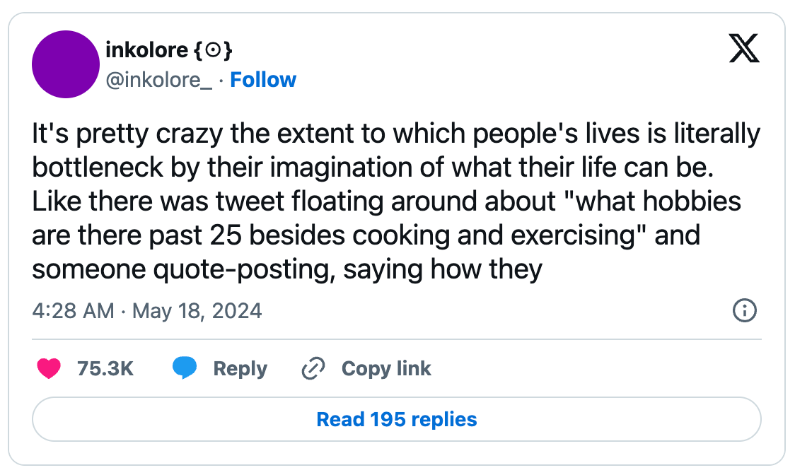 It's pretty crazy the extent to which people's lives are literally bottlenecked by their imagination of what their life can be.