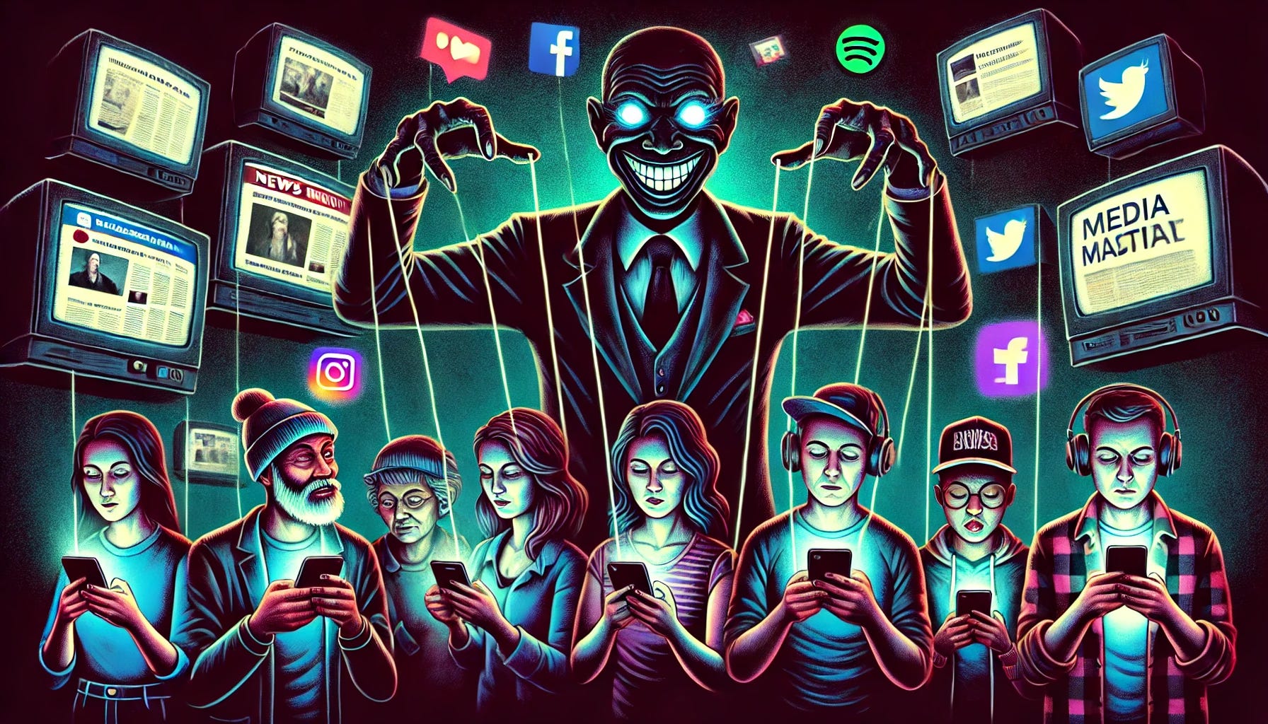 create an image of a super evil-looking puppet master controlling the media of a group of people.