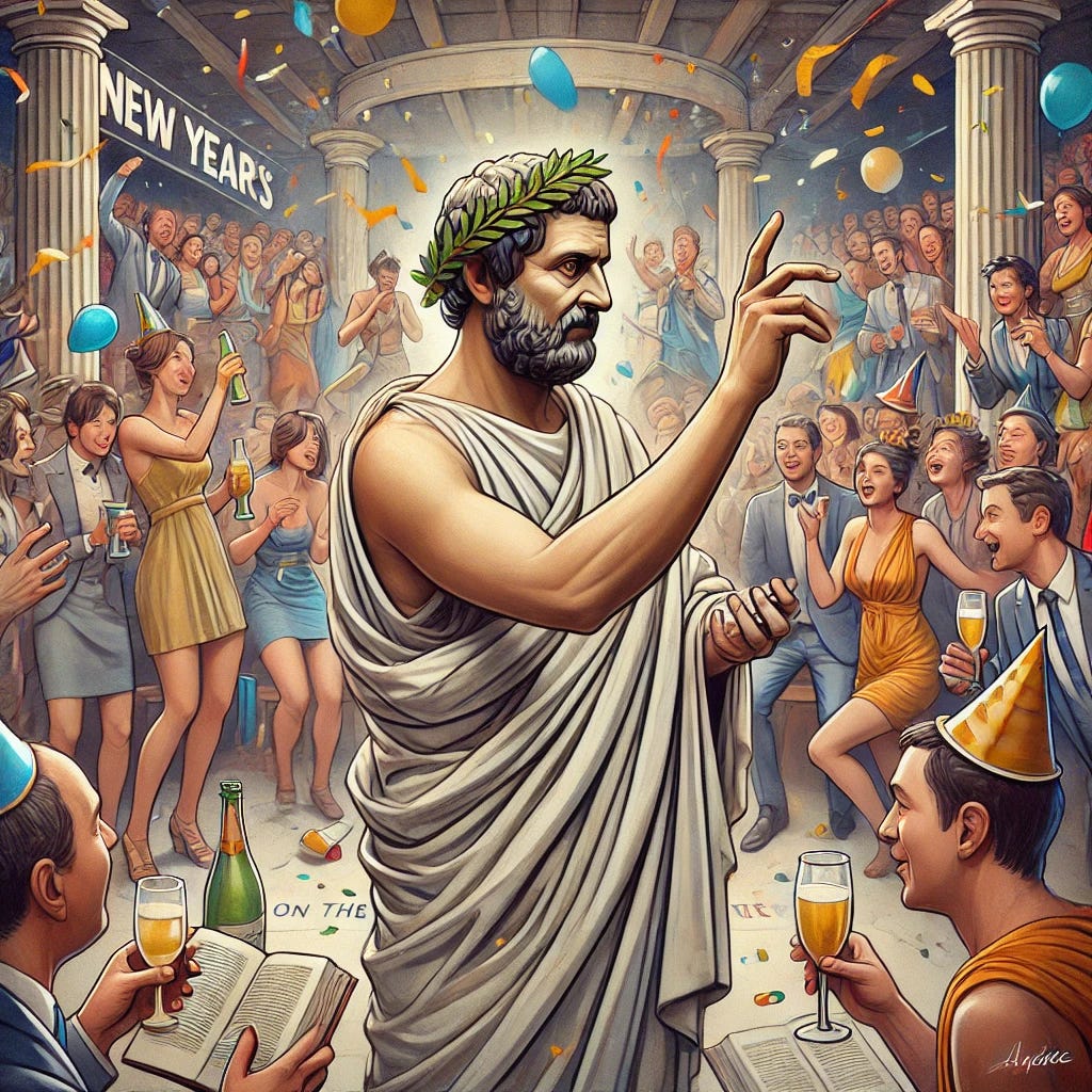 “Seneca at a New Year's party extolling the virtues of his On the Shortness of Life”