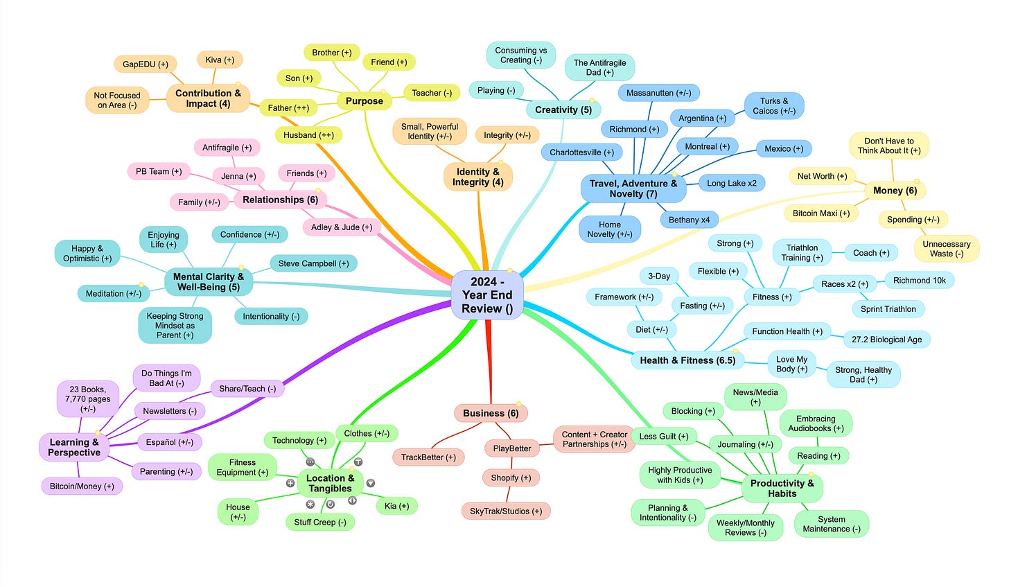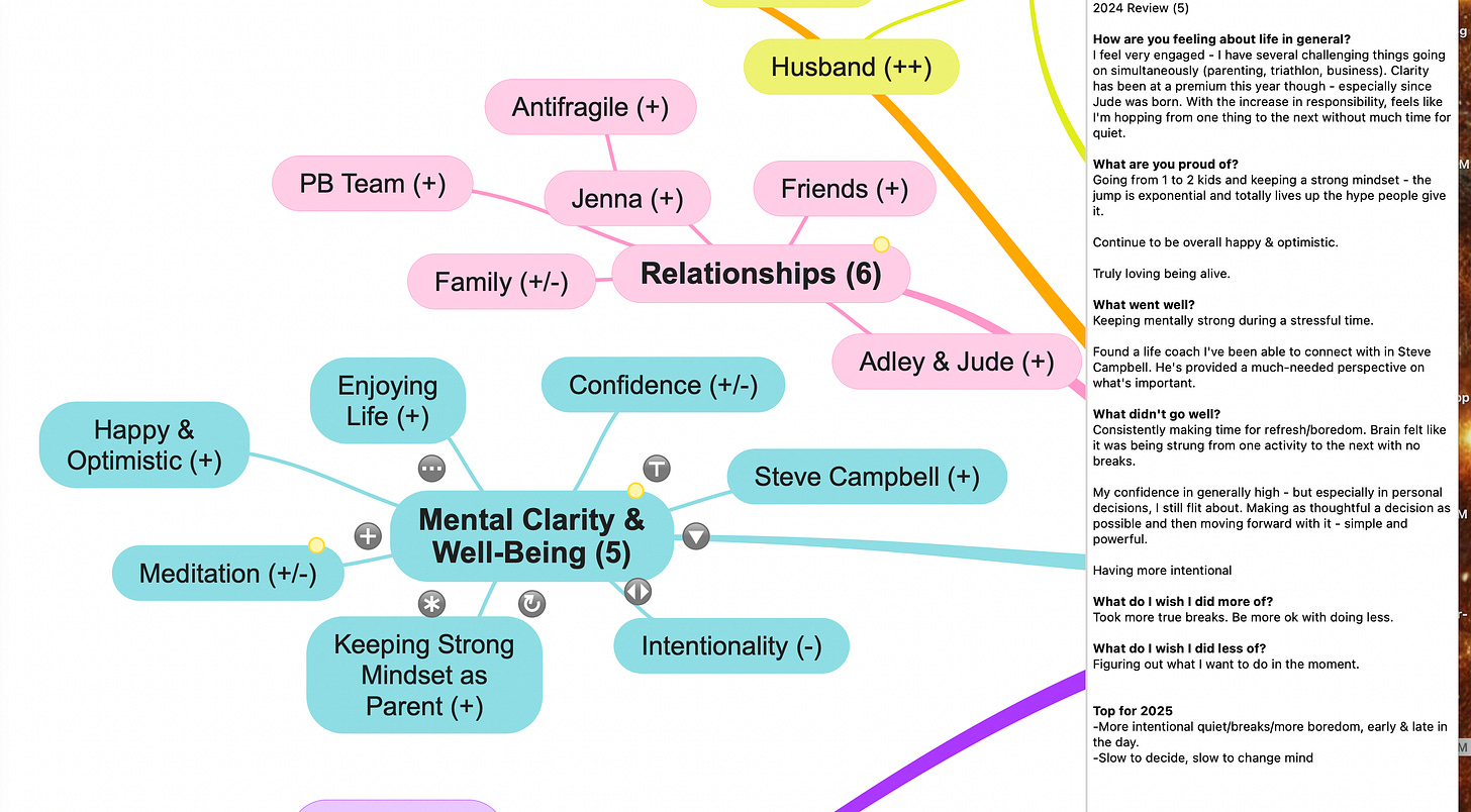 Here’s what my in-progress 2024 Review mind map looks like (I use a program called SimpleMind Pro):