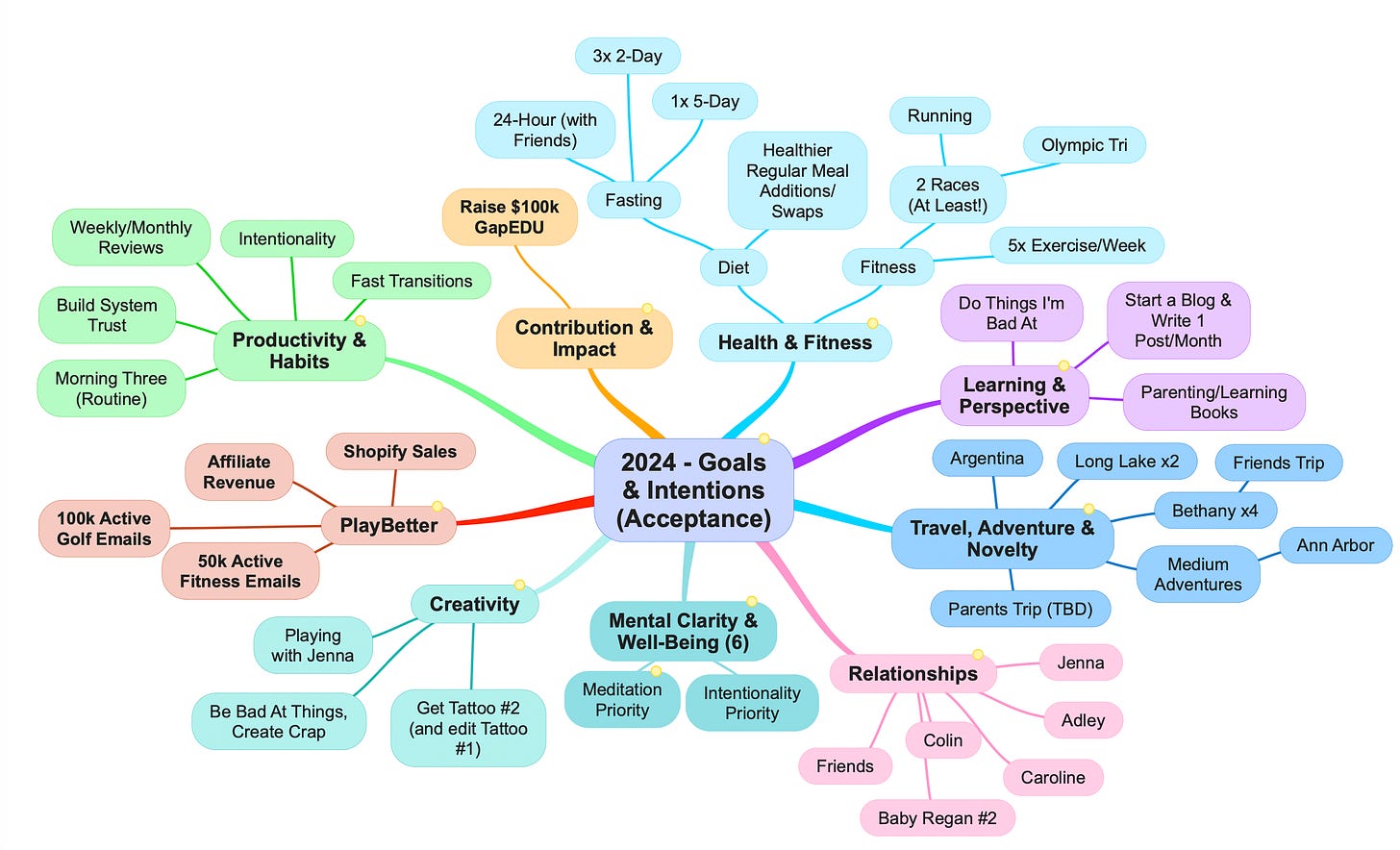 This is followed by another mind map, this one pointing to the future. I typically duplicate my Review map and leave only the areas I want to focus on. Here was mine at the start of 2024:
