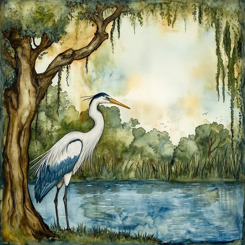 rests in his beauty on the water, and the great heron feeds